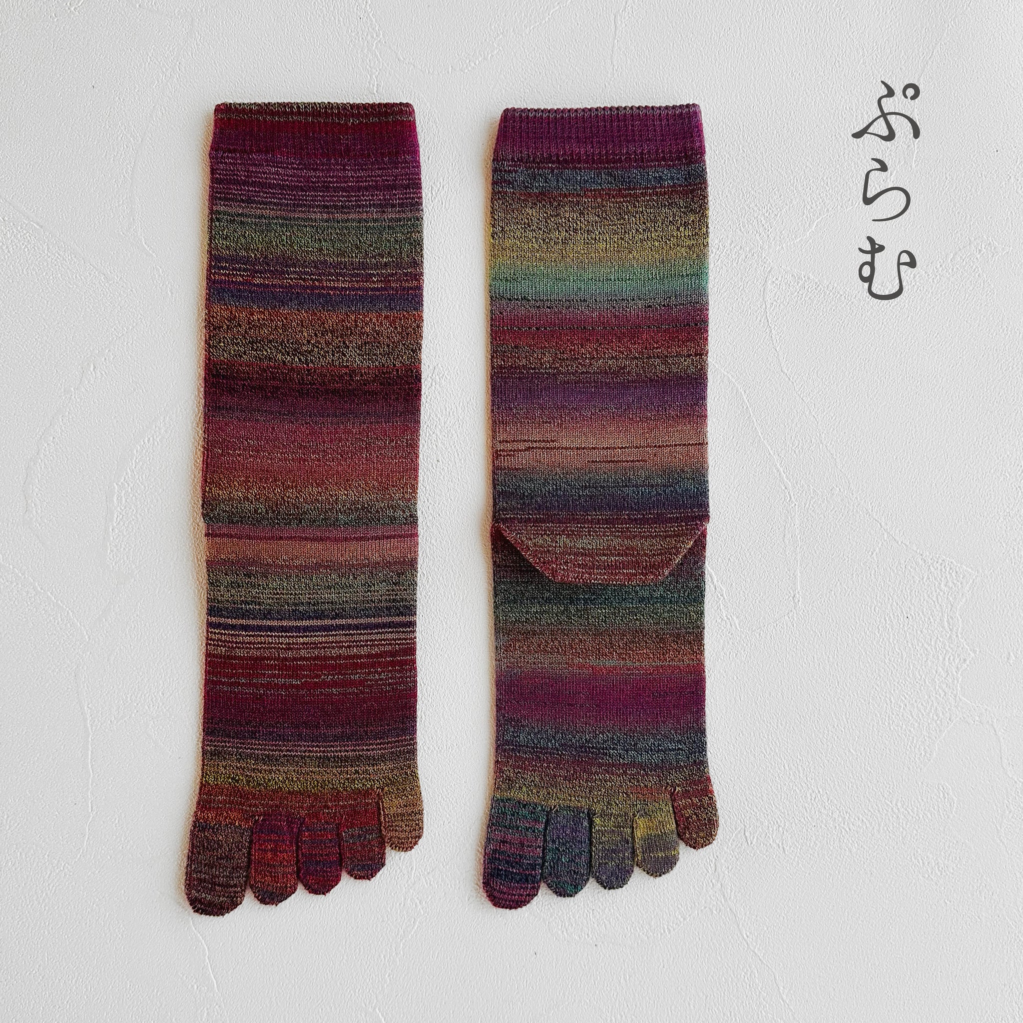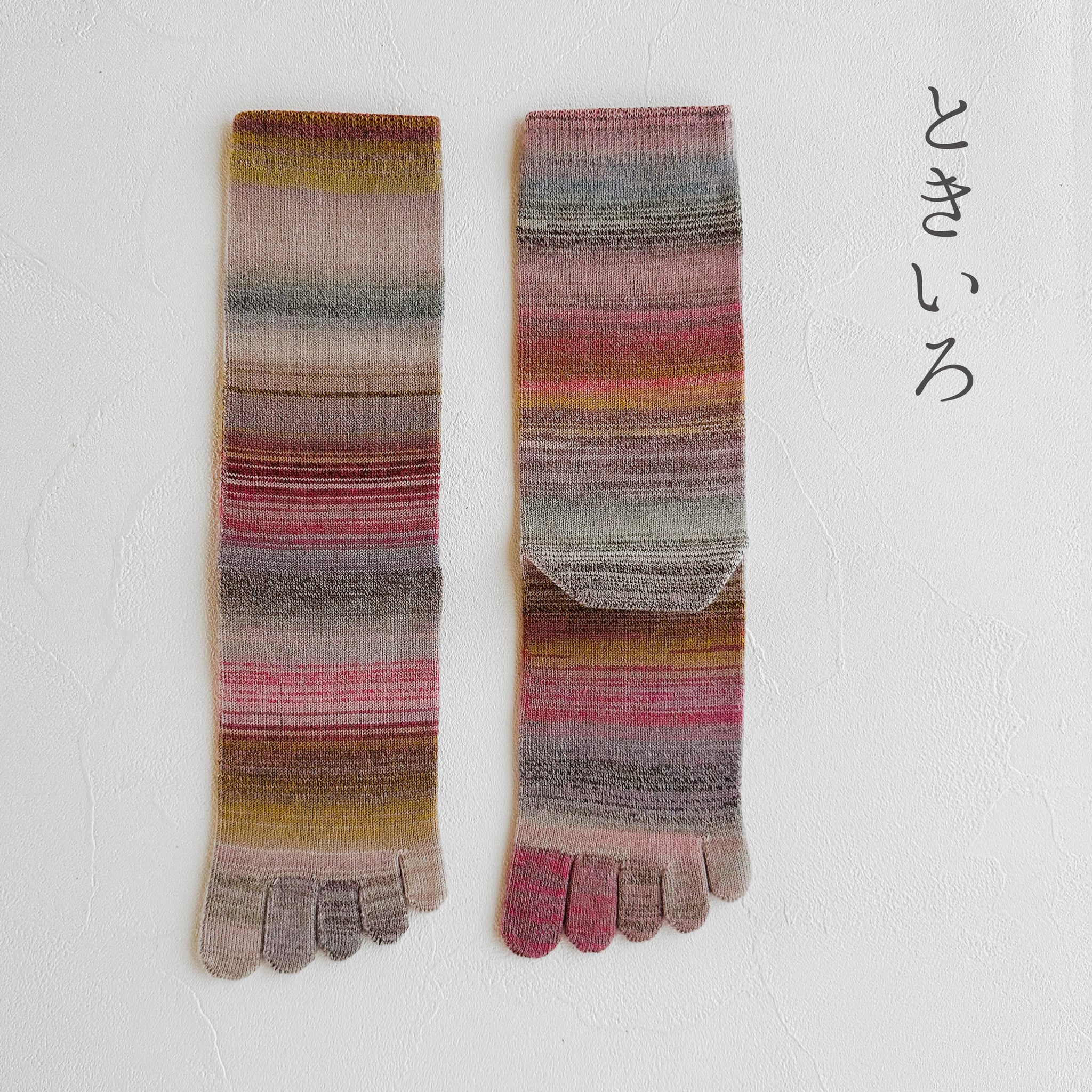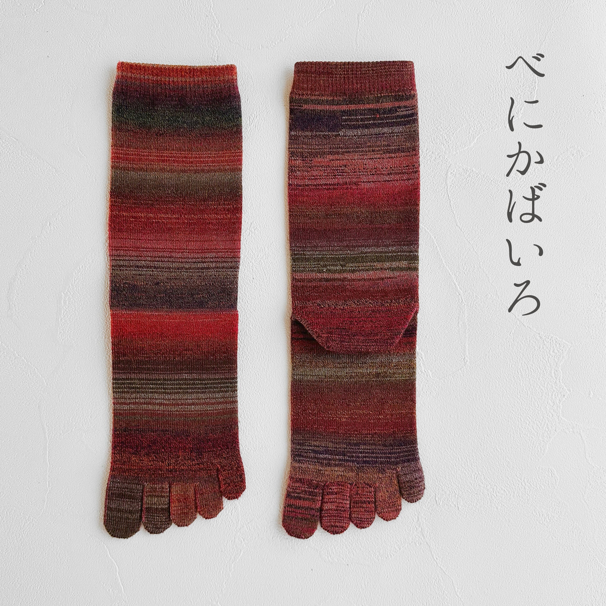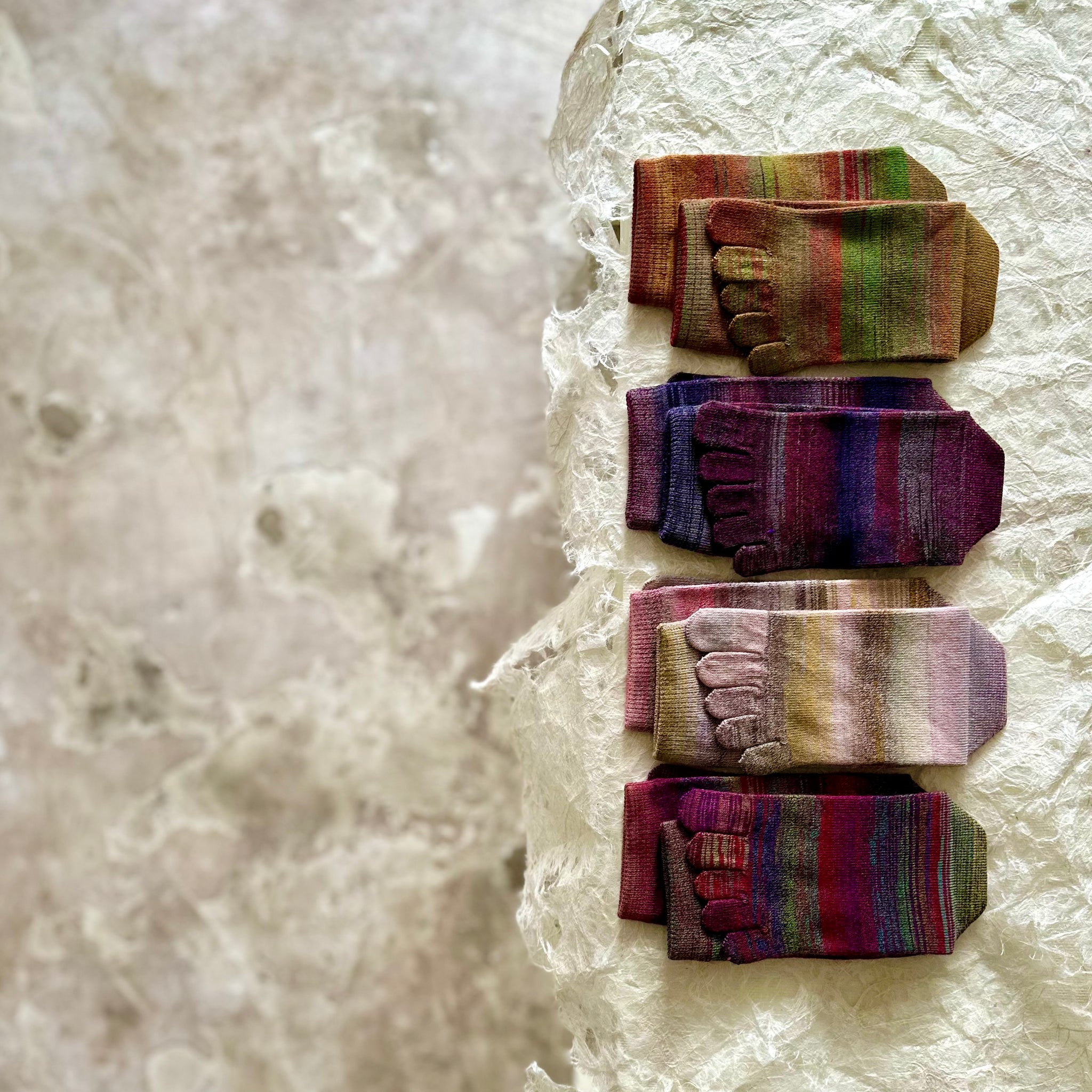 カラーは「かすり染め」という、糸一本に多色染めをした糸で、1足で自然な色の変化がある染色糸を使用。その柄の種類は無数で1枚1枚異なり、左右も柄感が変わり、カジュアルに足元を楽しめるソックスです。